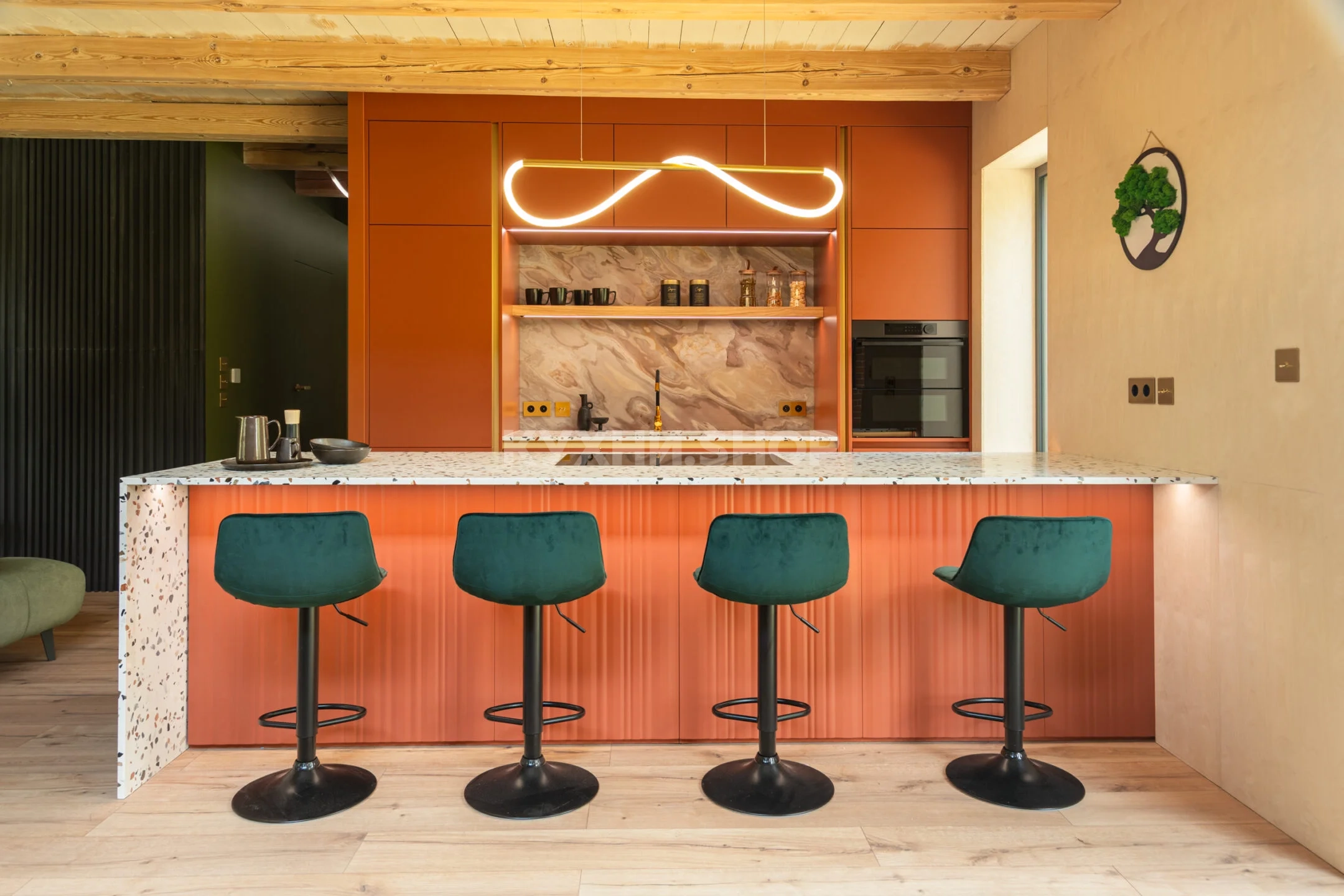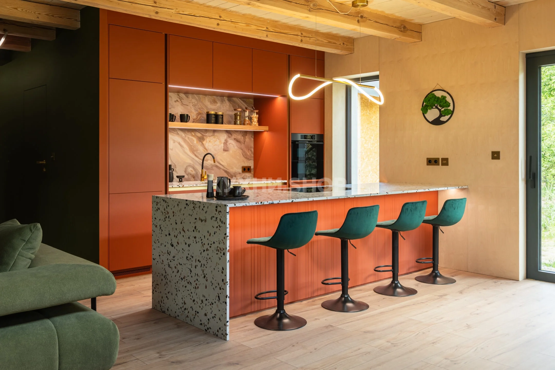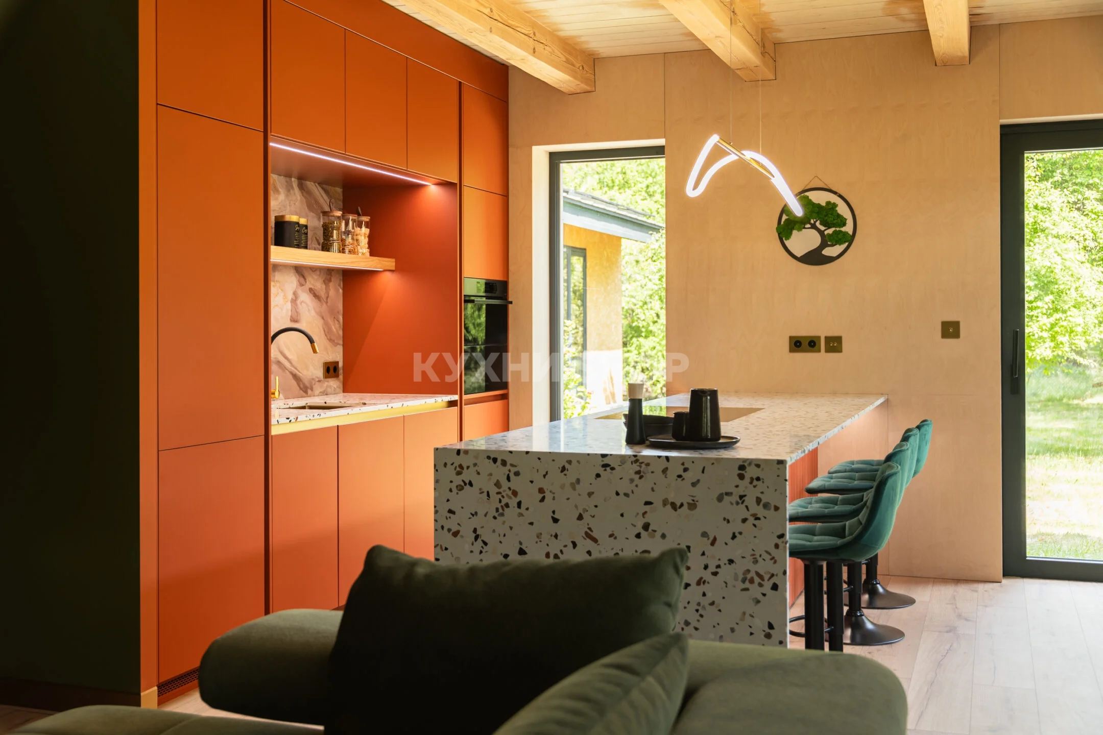 Изумрудные барные стулья привносят яркий цветовой акцент, создавая игру контрастов между теплыми и холодными оттенками. Футуристическая LED-подсветка над островом добавляет современности, а большие окна наполняют пространство естественным светом.